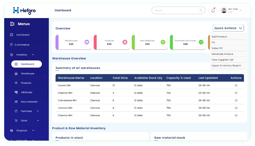 HEFGRO automatically tracks raw materials and finished products, manages purchase orders, sends invoice reminders, and monitors stock levels in real time.